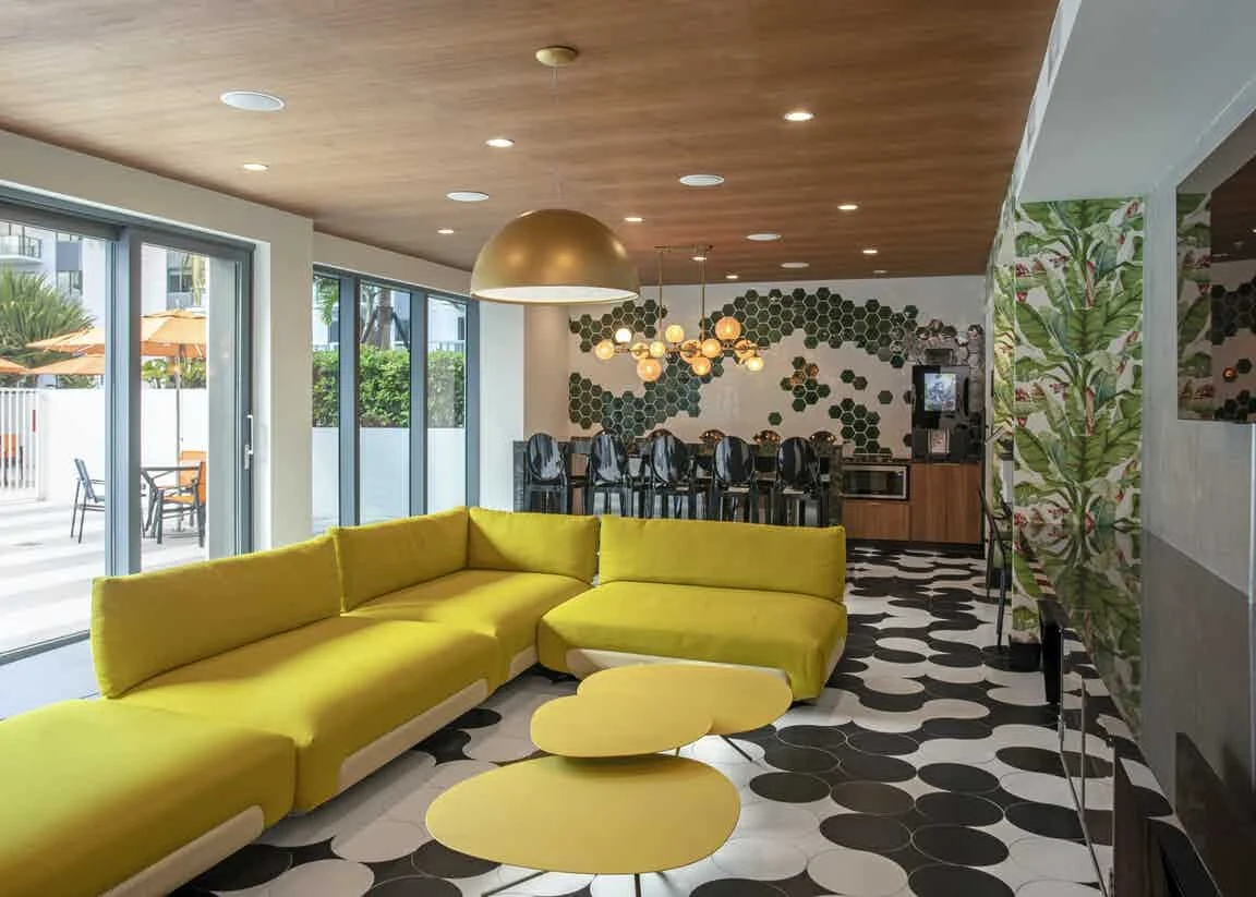 Once the Chiquita Banana Headquarters, the AMLI Residential in Midtown Miami is a 6.6 acre residential apartment complex designed by Zyscovich. Being so close to the famous Miami Arts District, the common areas are created to evoke an eclectic artsy vibe. The floor courtesy of Audrey Lane’s Happy pattern is an amazing canvas on which the lounge area is created.