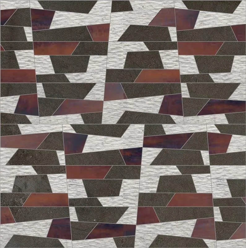 Marc Michaels Interior Design brought their signature sophistication to life with this striking installation of the Waterjet Wedge pattern, part of their exclusive designer collection with Audrey Lane. Featured behind the TV in this bold, light-filled living space, the custom composition combines line-textured beige limestone, honed brown limestone, and a metallic porcelain for dramatic contrast. The interplay of finishes and tones creates a dimensional surface that’s both refined and unexpected—perfectly balancing natural warmth with modern edge.