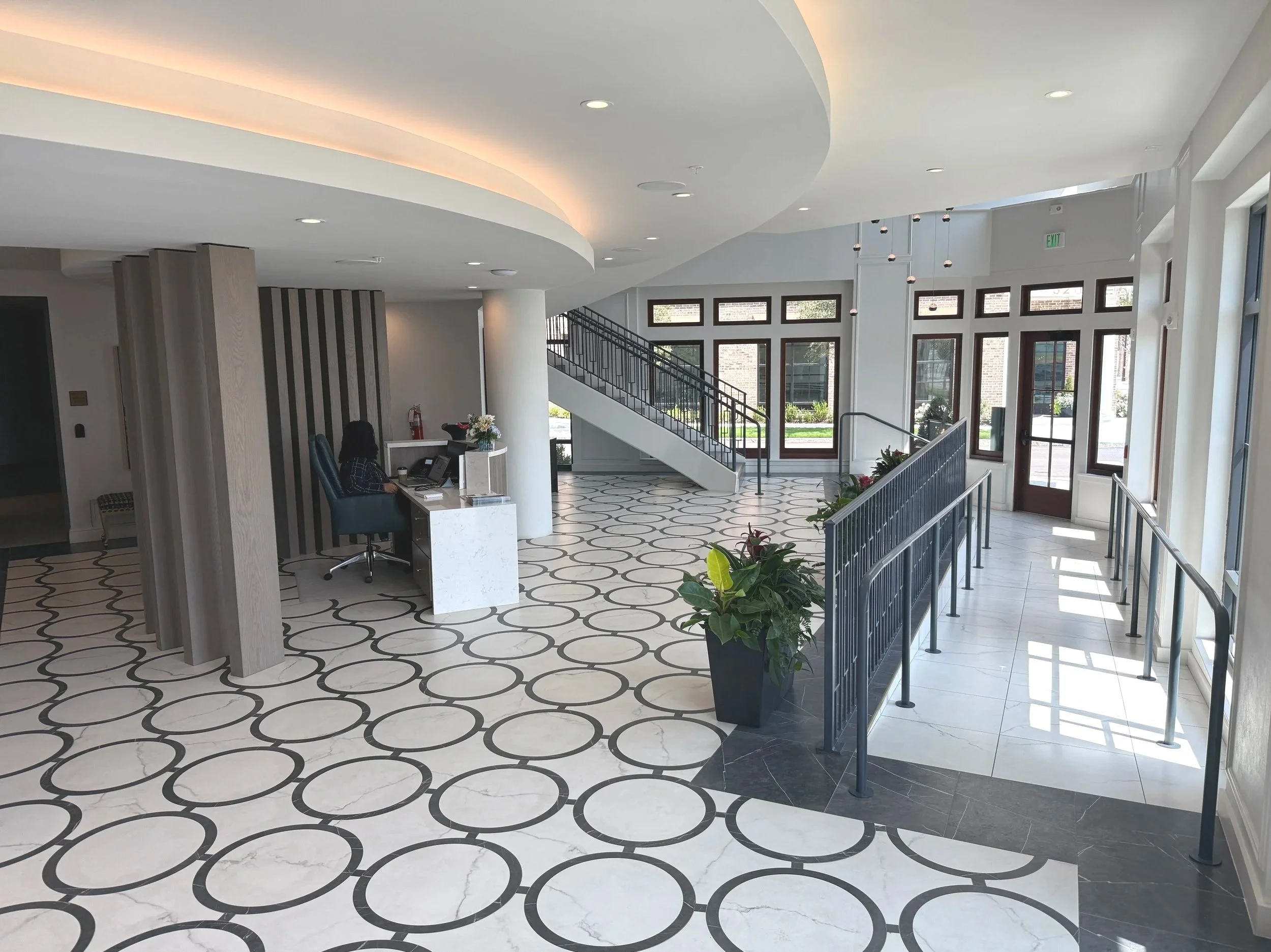 From the sweeping staircase to the light-filled lobby, the custom flooring sets the stage for a community that values creativity, comfort, and style—all starting right at your feet.